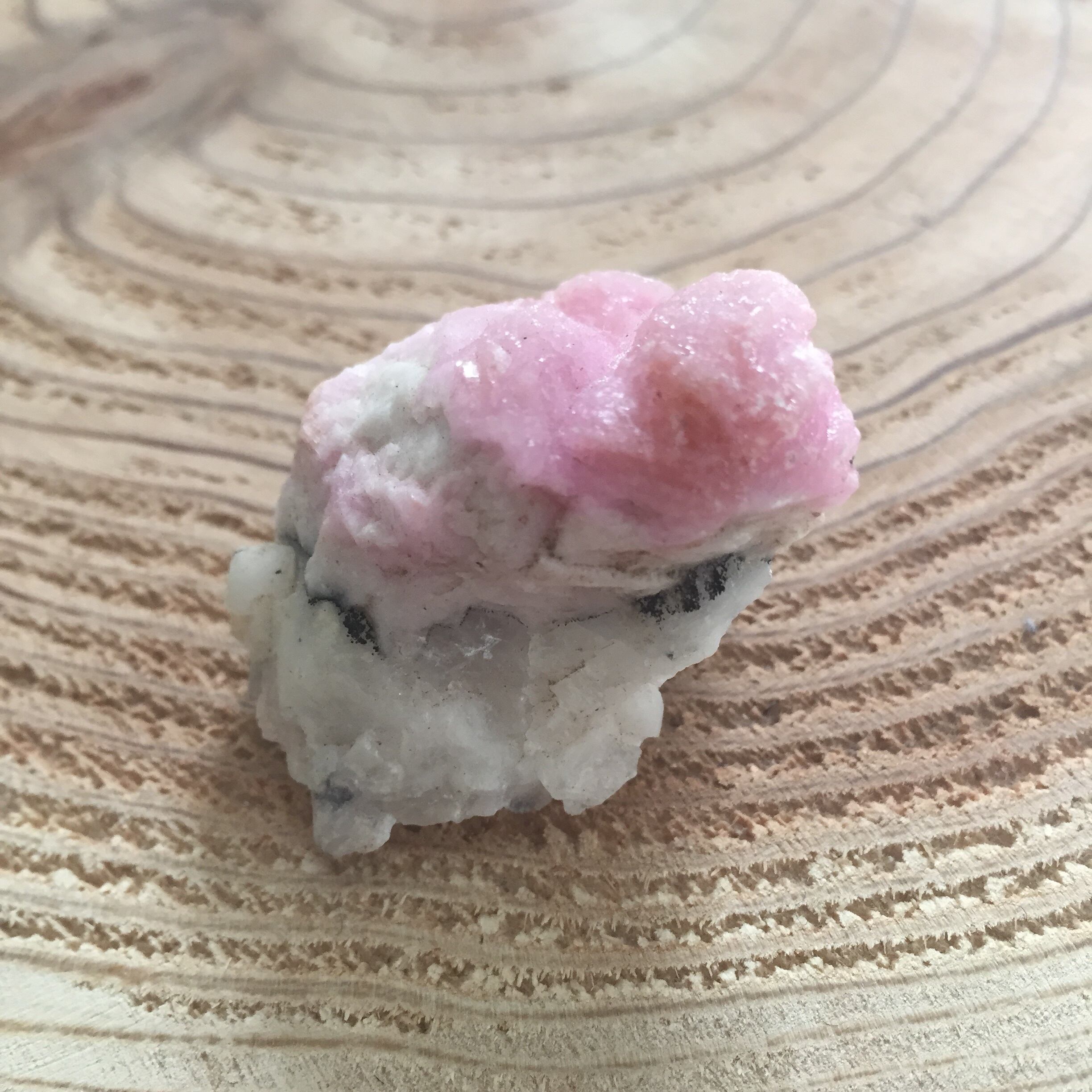 こちらの石はキラキラしたドュルージー状になっており、曇りのないピュアなピンクパープル色をしております。山になった頂上付近には日の出の太陽がの光が反射したような温かなオレンジ色もみられます。母岩の部分までキラキラして輝いております。別名アフロディーテの石とも言われますが、アフロディーテの愛のパワーが降り注いでいるかのようです。