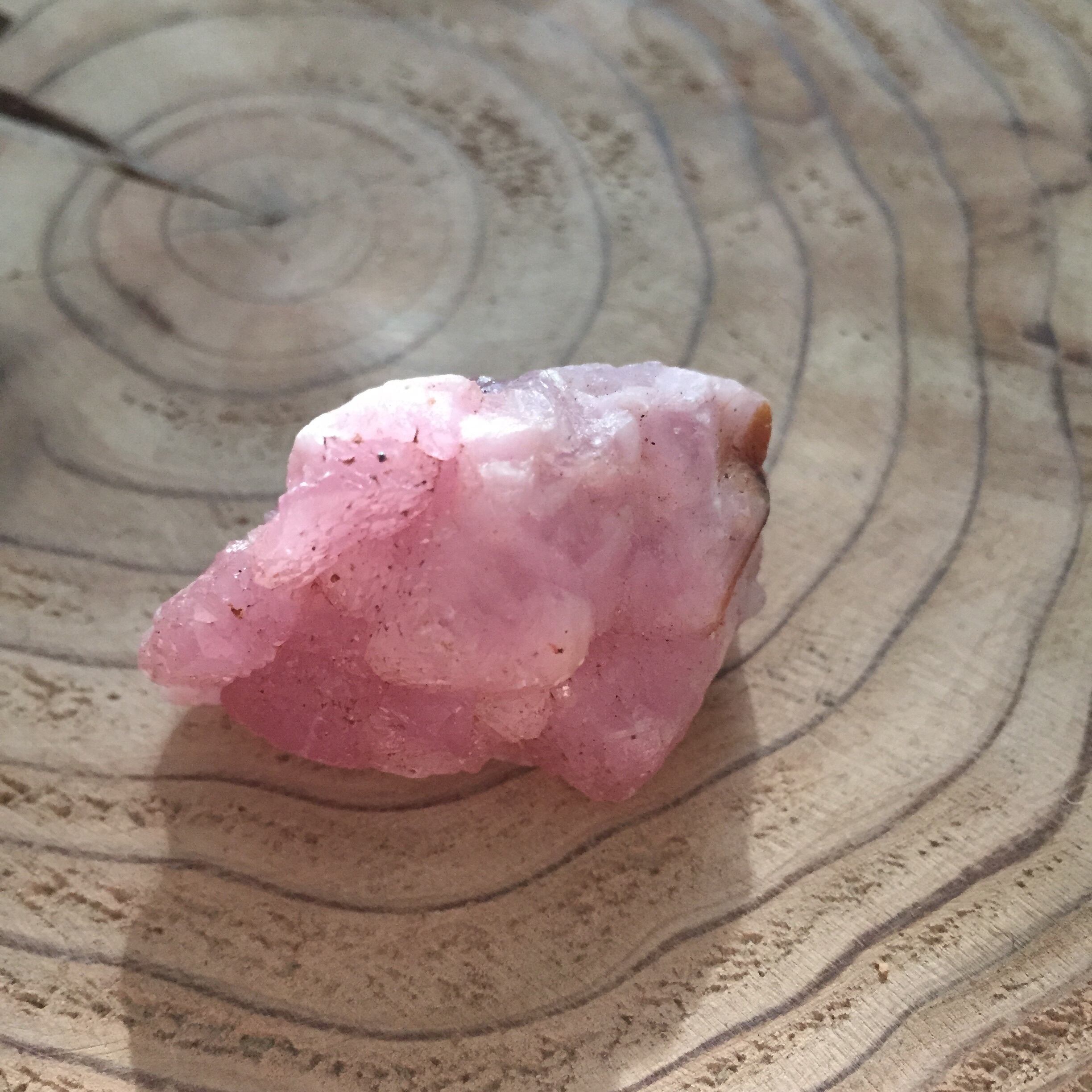 落ち着いた大人のピンクで、パープルピンクに透ける結晶部分もあります。また、母岩に近い根元の部分が濃いダークピンクになっており、内から溢れ出す愛の源のようになっています。そこから絶え間なく愛が放出されており、エネルギーを内から沸き起こします。そして、内から湧き出た愛が積み重なり、大きく成長していきます。