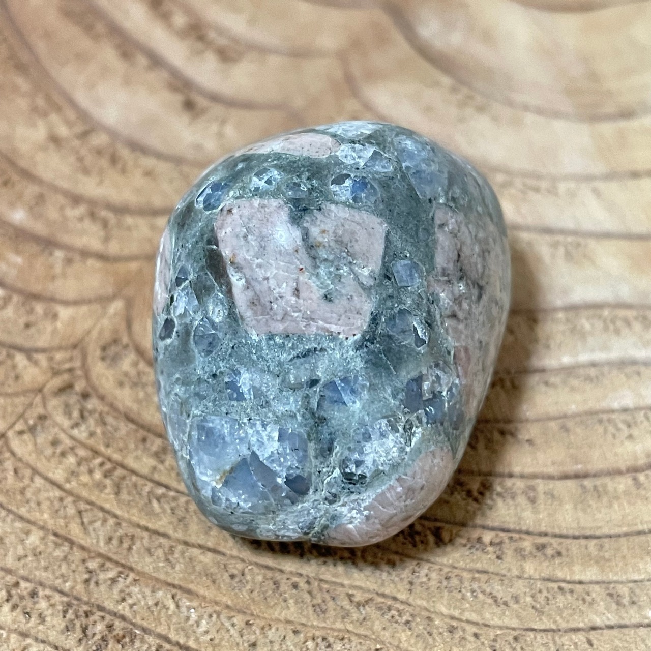こちらはピンクのカオリナイトとブルークォーツがバランスよく入って、綺麗なタイプになります。形もおにぎりみたいで、可愛い子です^^